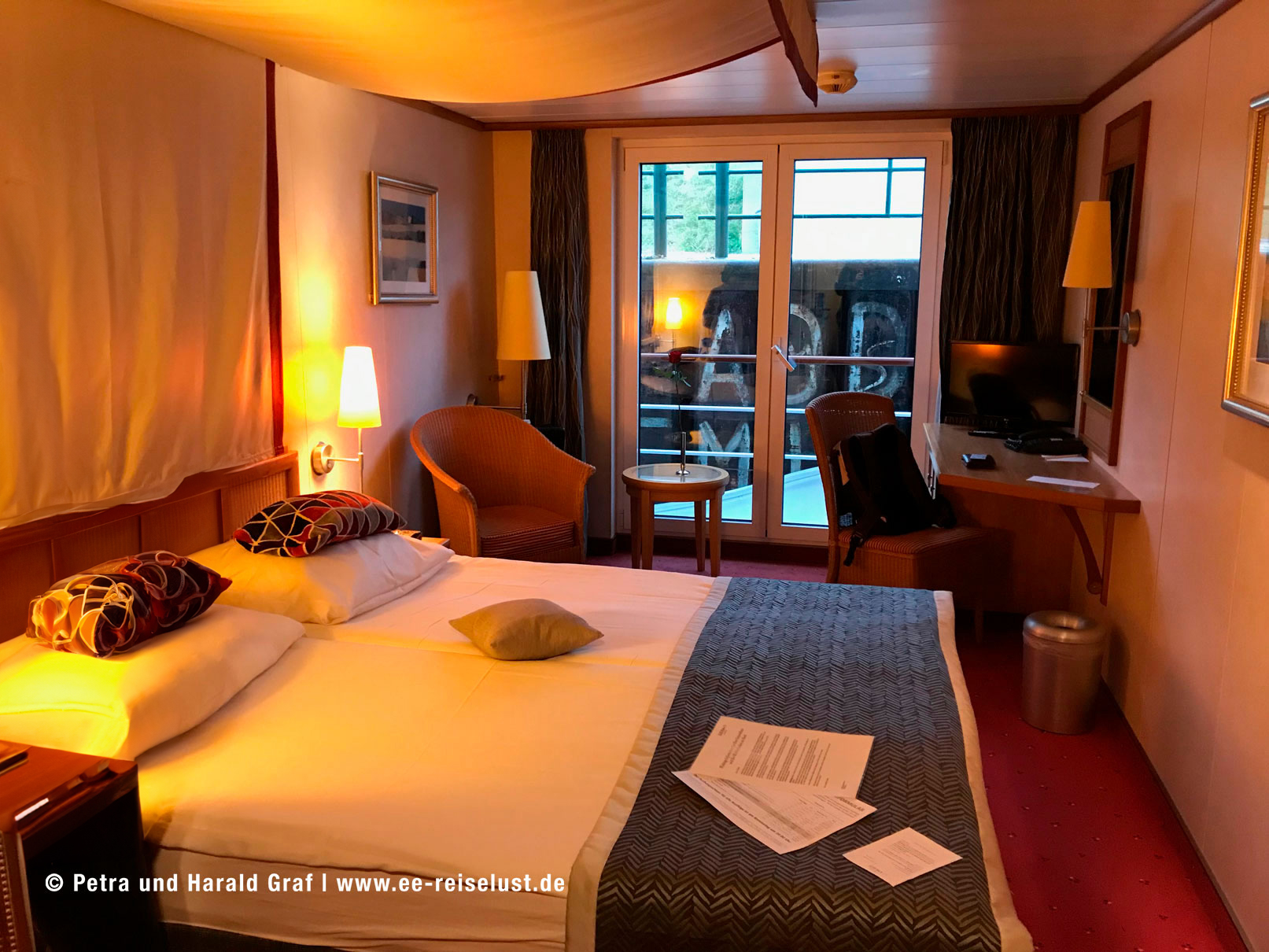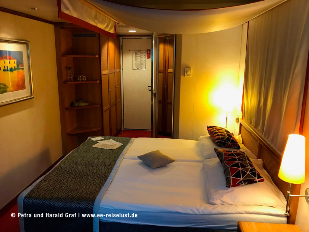 Kabine 242 war schon bereit für uns. Sie war geräumig und hatte einen französischen Balkon. Wir machten uns gleich auf den Weg zur Bar, wo Häppchen mit Schinken und Brownies bereitstanden. Mit einem Glas Sekt stießen wir auf unsere Reise an.