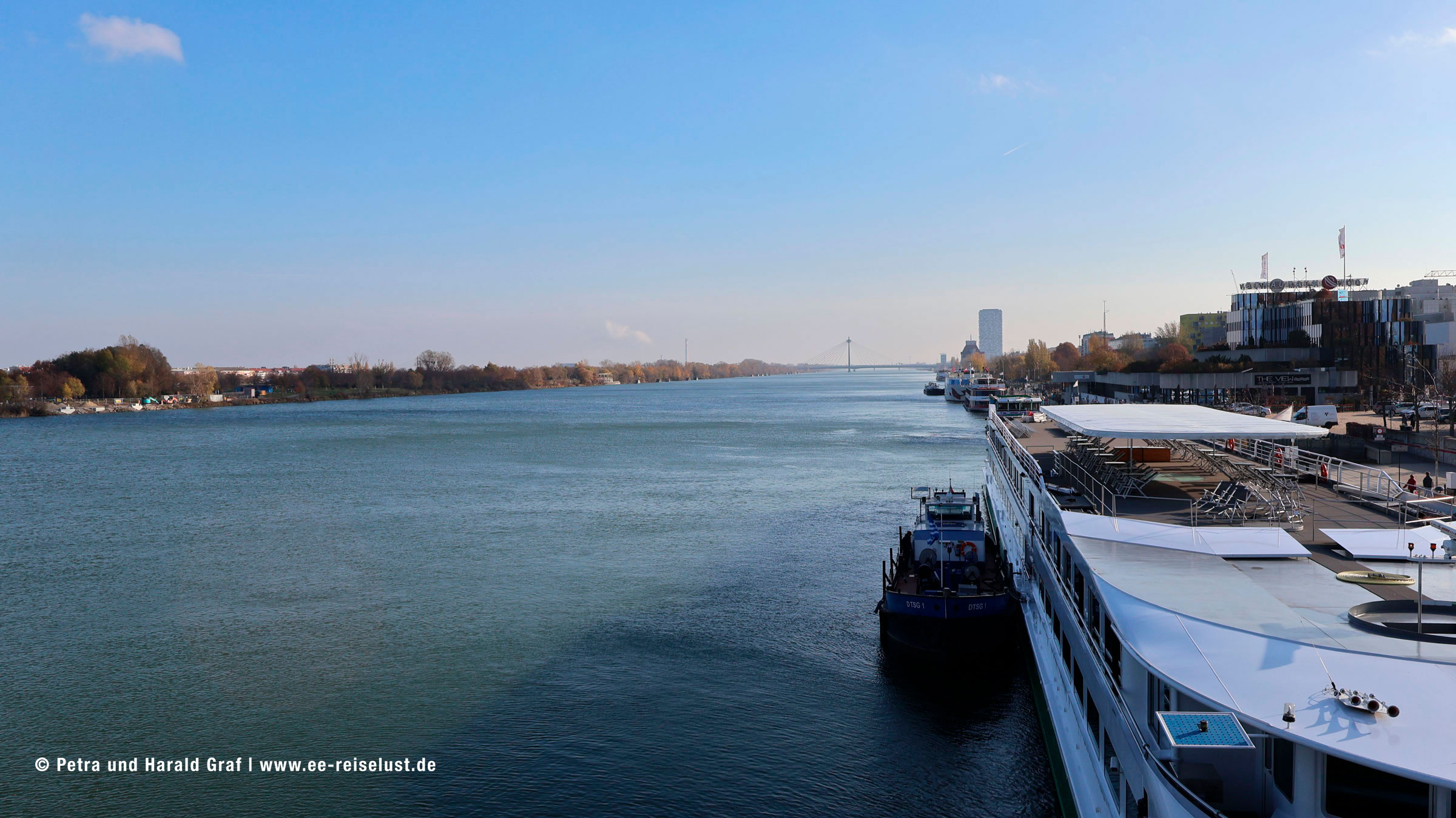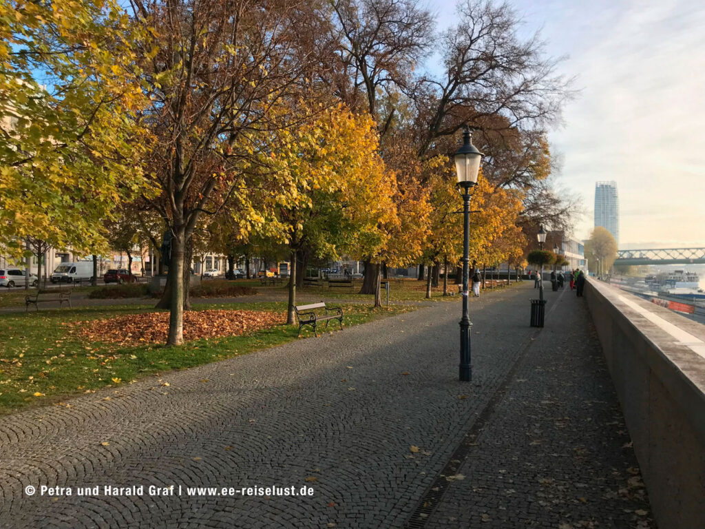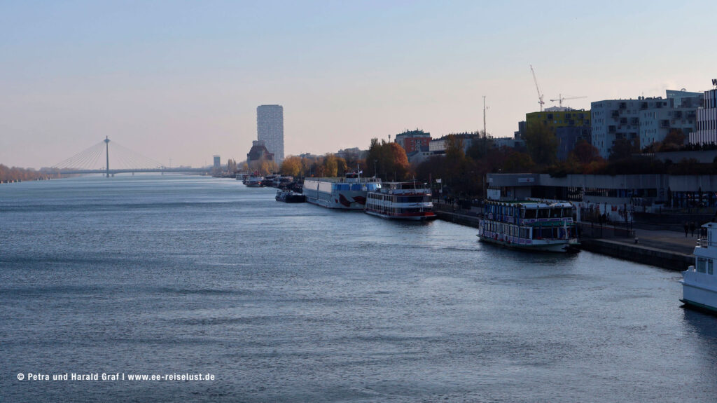 Aber zuerst wollten wir in den Donaupark. Laut Google Maps 34 Minuten. Frohgemut machten wir uns auf den Weg. Nach dem Verlassen des Schiffes rechts den Weg entlang bis zur Reichsbrücke.