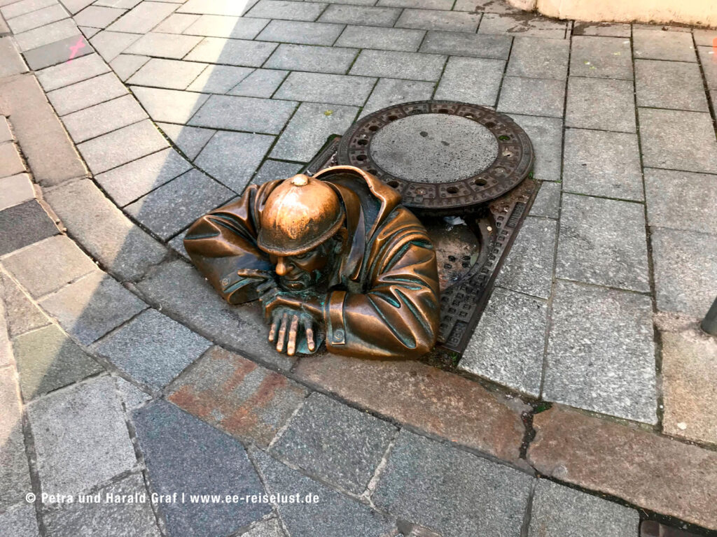 Wir schlenderten durch Bratislavas „Old Town“ und kamen zu der Bronzestatue Cumil, dem Kanalarbeiter oder auch bekannt unter dem Namen „Man at Work“. Zu ihm gibt es eine Legende und dazu eine lustige Geschichte.