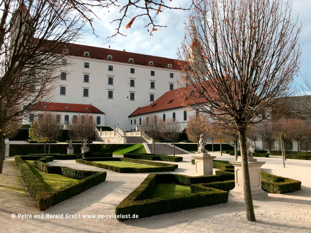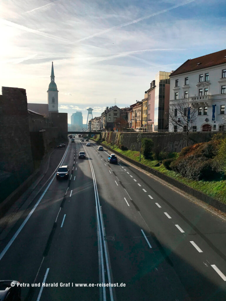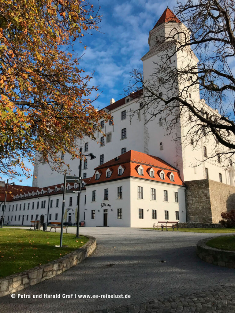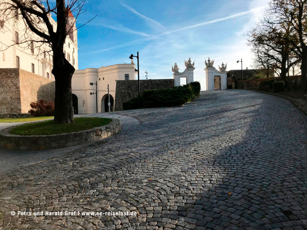Die Pressburger Burg liegt auf einem 85 m hohen Hügel. Der Aufstieg war steil und leicht anstrengend, aber der Ausblick von oben faszinierend. Unter uns lag Bratislava mit seiner UFO-Brücke und das lange Band der blauen Donau.