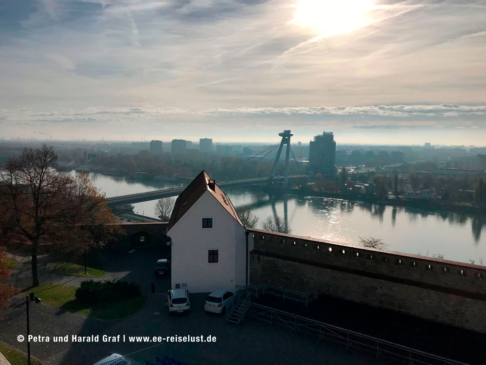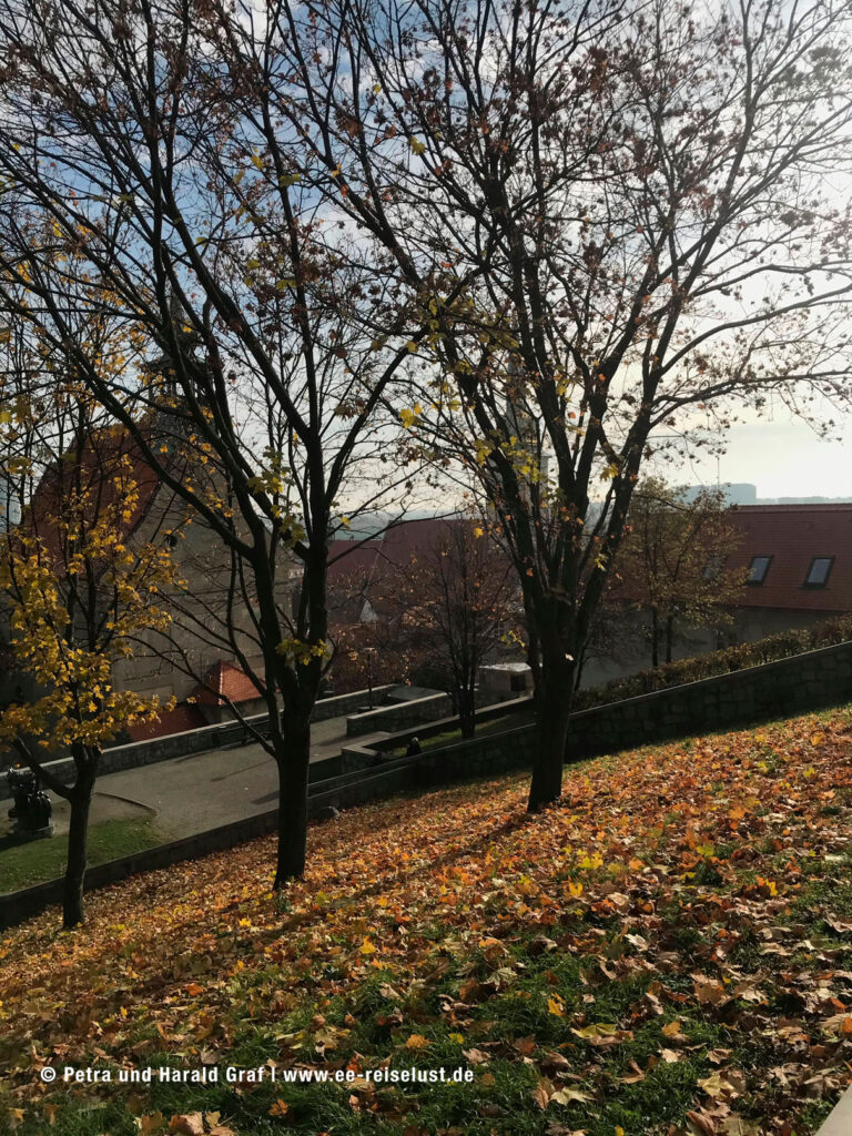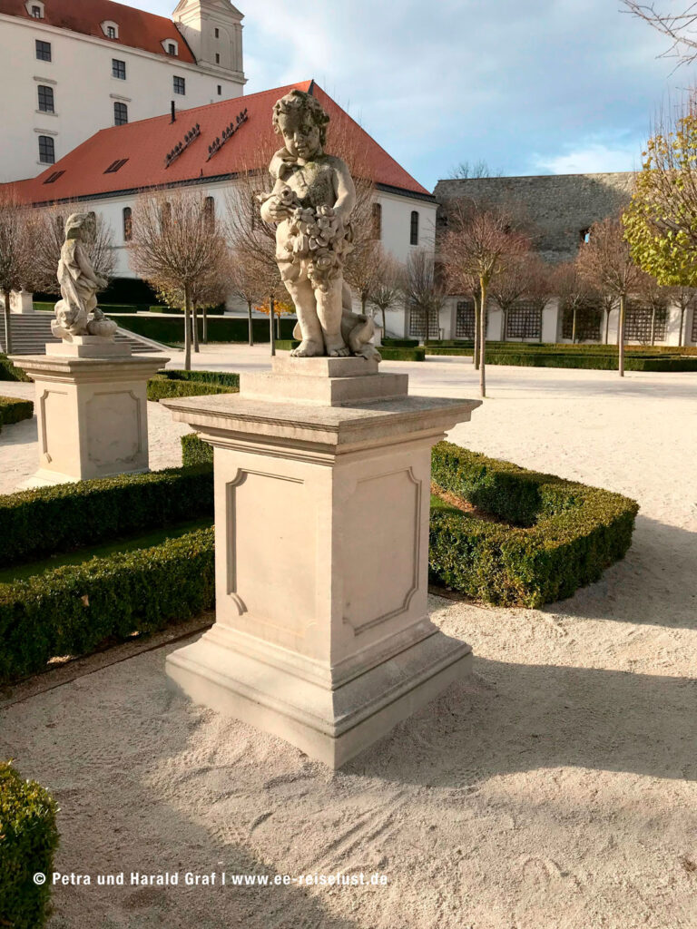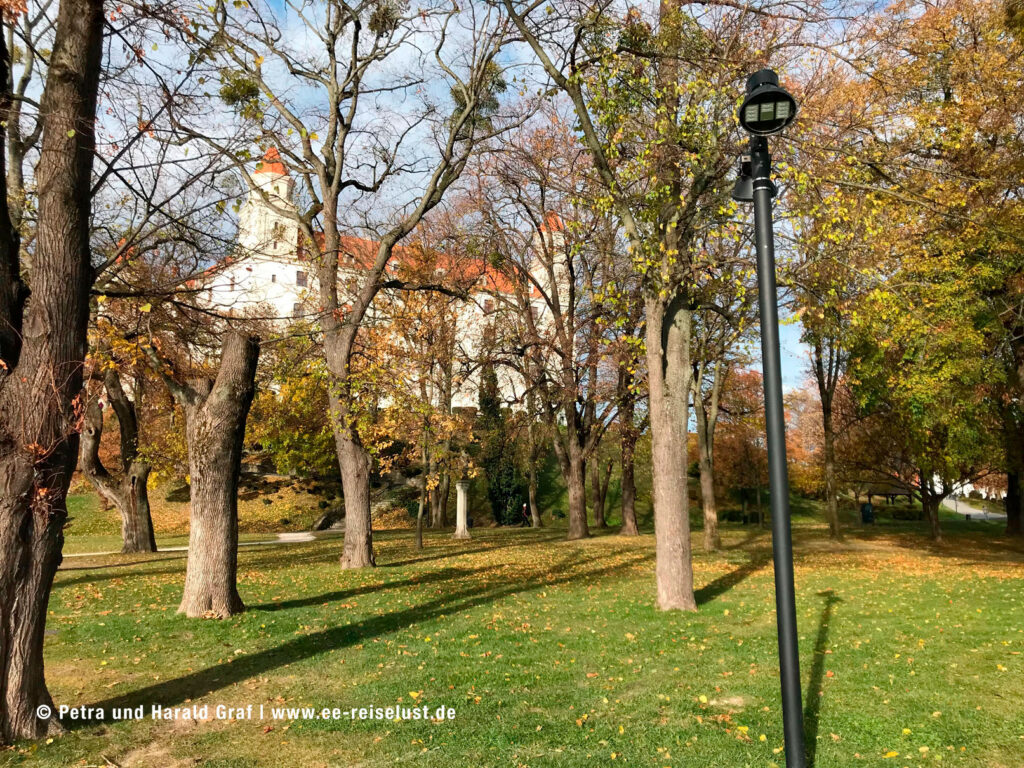 Die Pressburger Burg liegt auf einem 85 m hohen Hügel. Der Aufstieg war steil und leicht anstrengend, aber der Ausblick von oben faszinierend. Unter uns lag Bratislava mit seiner UFO-Brücke und das lange Band der blauen Donau.