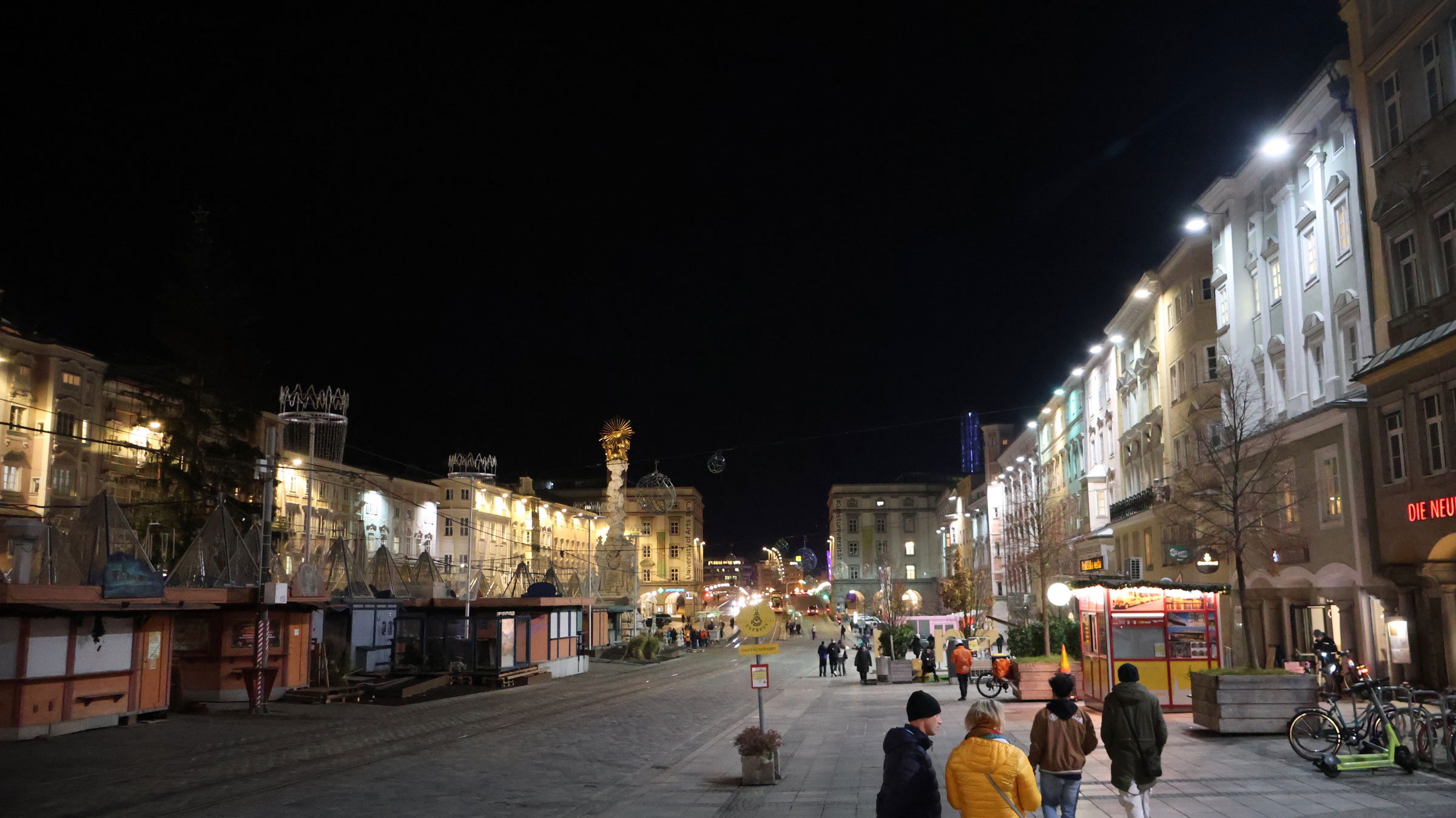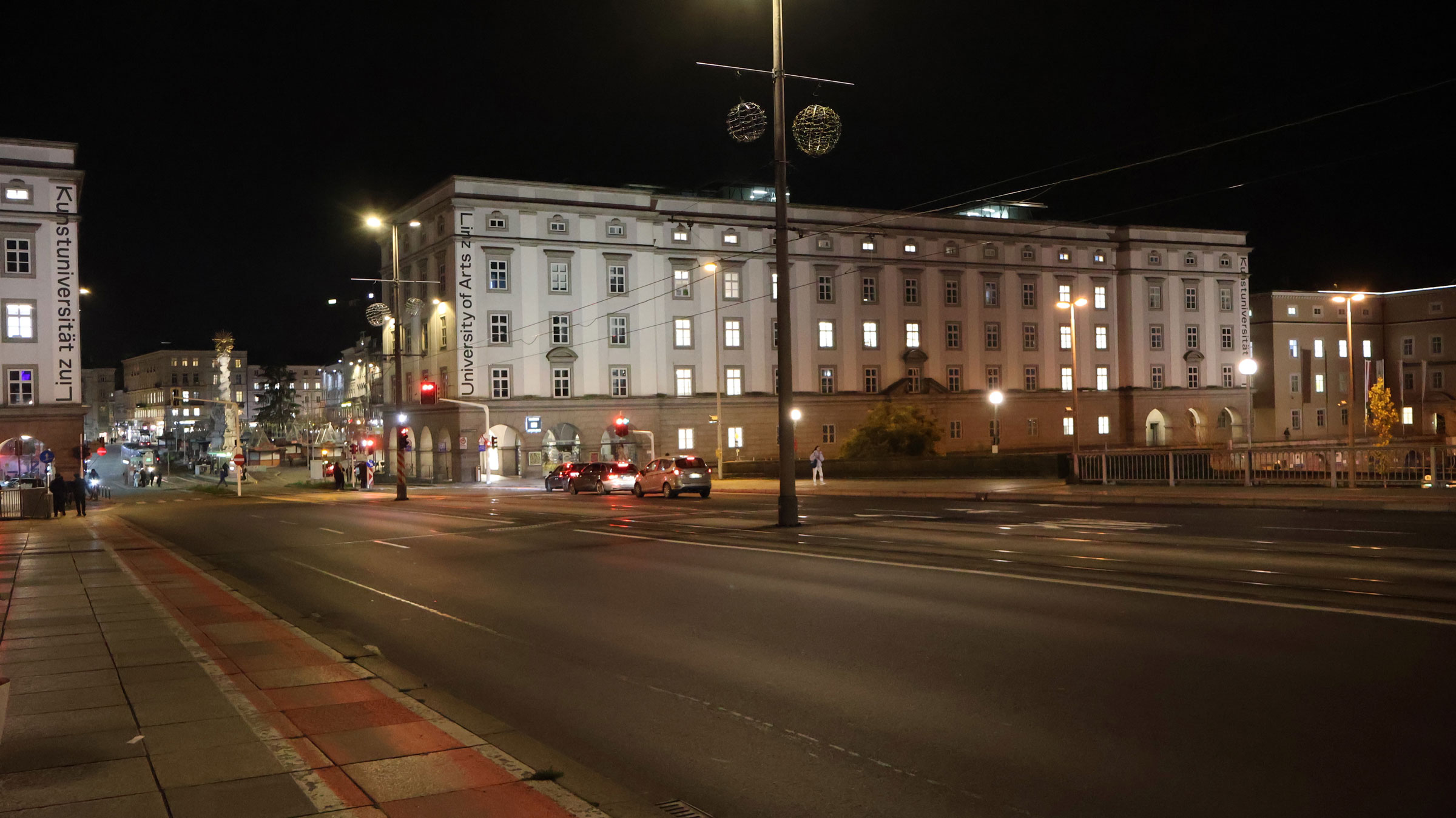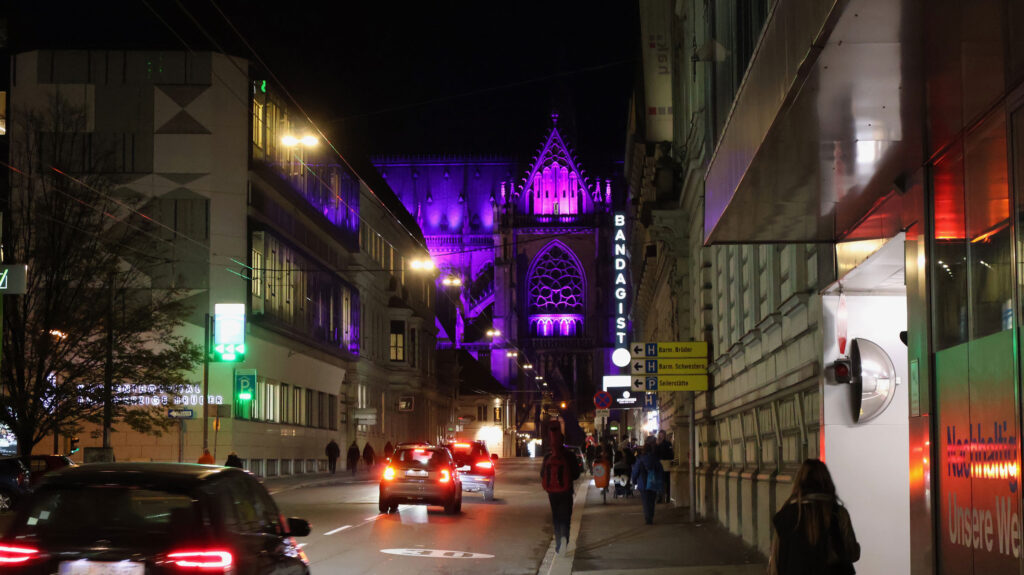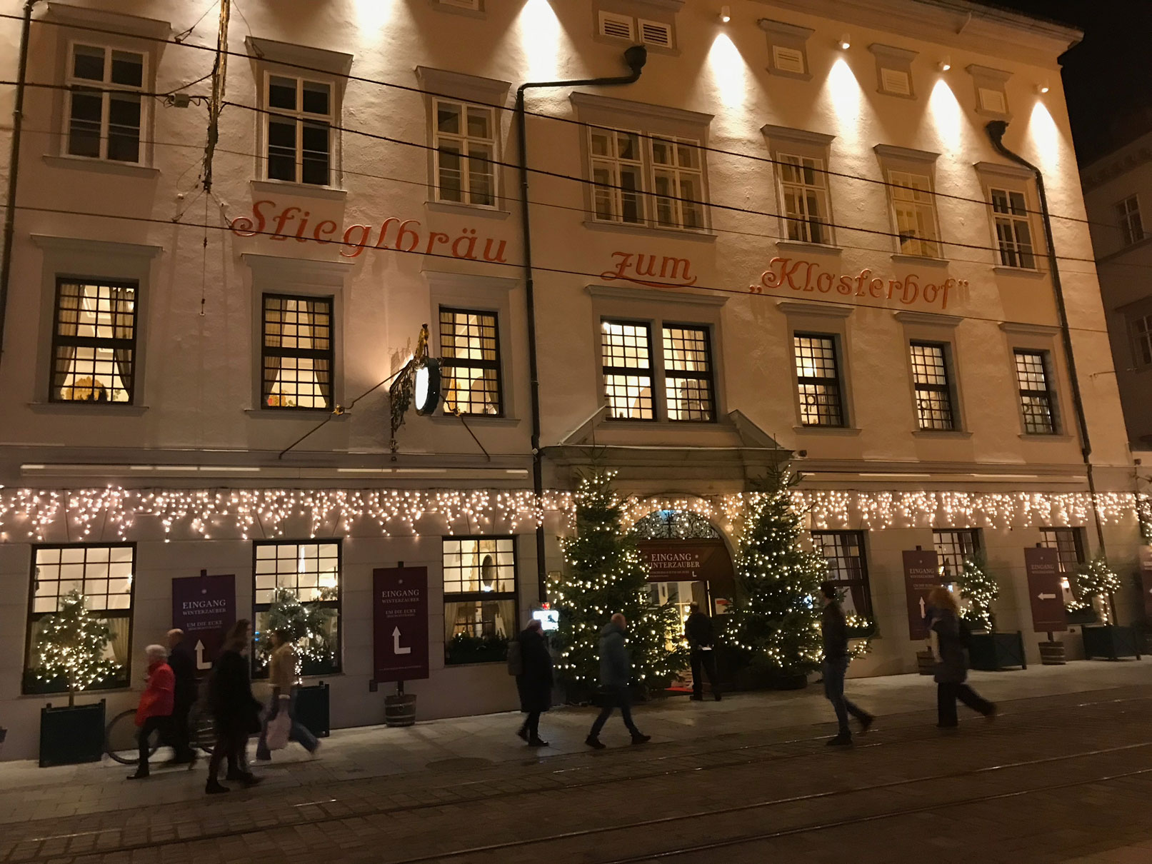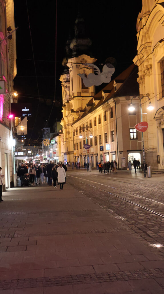 Wir ließen rechts von uns „Stiegl Klosterhof“ mit seinem Weihnachtsmarkt liegen. Sehr sehenswert mit seinen kleinen Nischen und leckerem Glühwein. Wir besuchten ihn voriges Jahr und waren begeistert. Etwas weiter, bei der Mozartkreuzung, lugte der „Mariä-Empfängnis-Dom“, ein neugotischer, römisch-katholischer Kirchenbau – der auch Mariendom und Neuer Dom genannt wird – in Magentatönen angestrahlt zwischen den Häusern hervor.