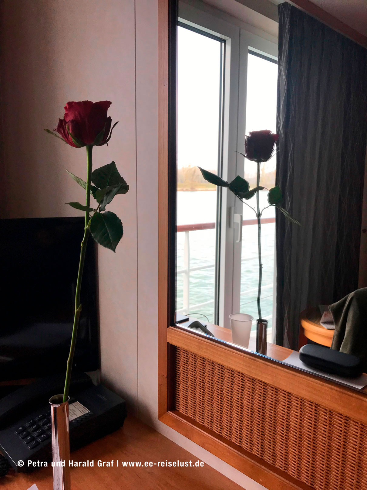 Die Fahrt nach Engelhartszell dauerte ungefähr 45 Minuten. Um unser Gepäck mussten wir uns nicht kümmern, das brachte man uns zur Kabine. Jeder Dame wurde beim Einsteigen eine rote Rose überreicht. Fand ich schön.