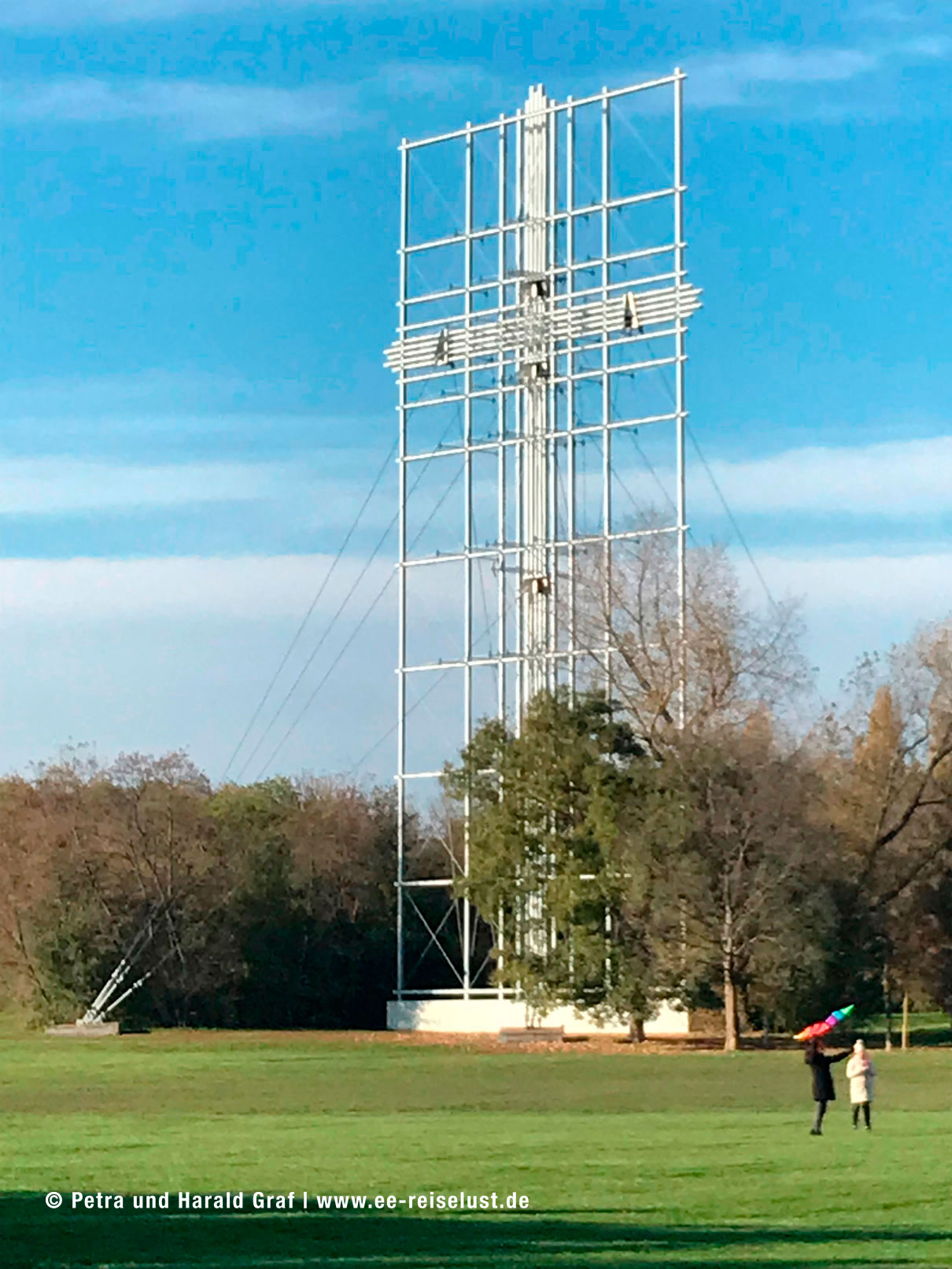 Der Turm ist bis heute das höchste Bauwerk Österreichs. Nach ein paar Minuten erreichten wir die Papstwiese mit dem Papstkreuz. Es ist aus Stahl, 40 m hoch und 56 t schwer. Es wurde 1983 auf der rund 20 Hektar großen Wiese, anlässlich des Papstbesuches errichtet. 300.000 Gläubige feierten am 11.9.1983 mit dem Papst die hl. Messe.
