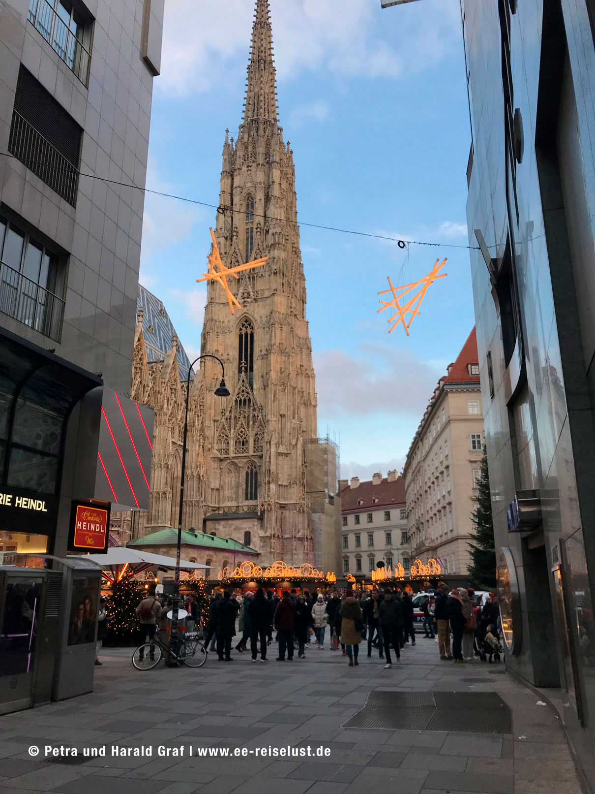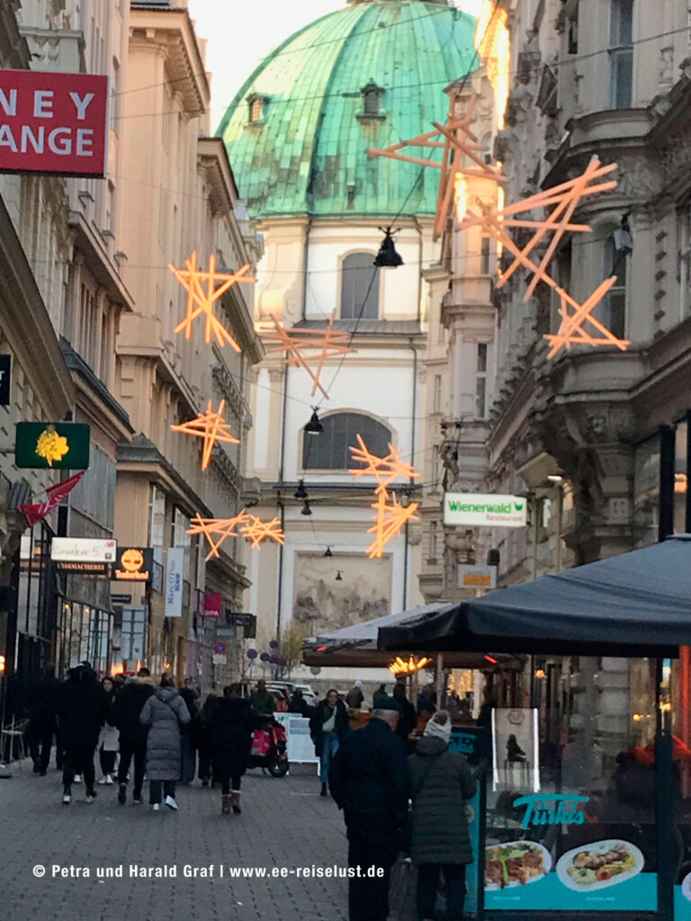 Der Park war wunderschön, sogar im November. Man könnte den ganzen Tag darin verbringen, aber wir wollten ja noch auf den Weihnachtsmarkt. Also zurück zur U-Bahnhaltestelle „Kaisermühlen“ und mit der U1 zum Stephansdom. Am Stephansplatz angekommen, schlenderten wir einmal kurz durch den Weihnachtsmarkt.
