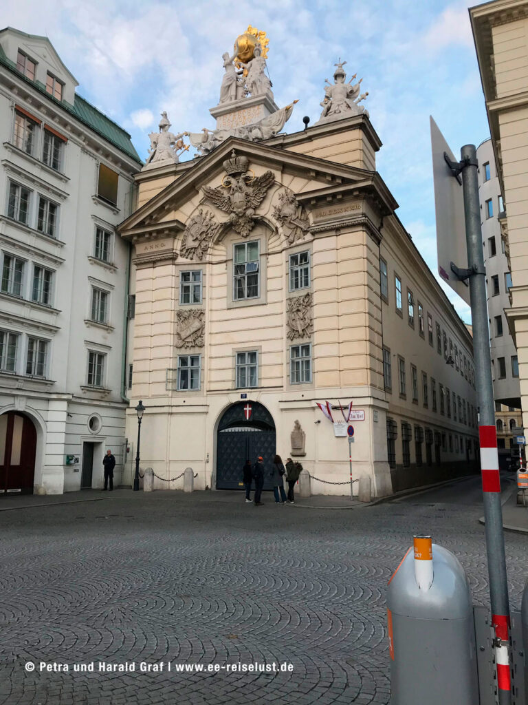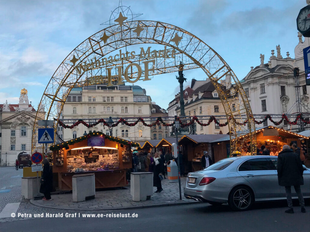 Da es immer kälter wurde und uns ein heißer Glühwein vorschwebte, ließen wir uns von google maps zum Weihnachtsmarkt „Am Hof“ leiten. Vom Stephansplatz zum Graben, diesem folgen bis zum Kohlmarkt, dann rechts und gleich wieder links in die Bognergasse. Ihr folgten wir bis zum Weihnachtsmarkt. Unser erster Weg: Zum Glühweinstand. Hier war der Glühwein glatt um 40 Cent billiger. Also 2 Glühweine und schon 80 Cent gespart. Ist das nichts?