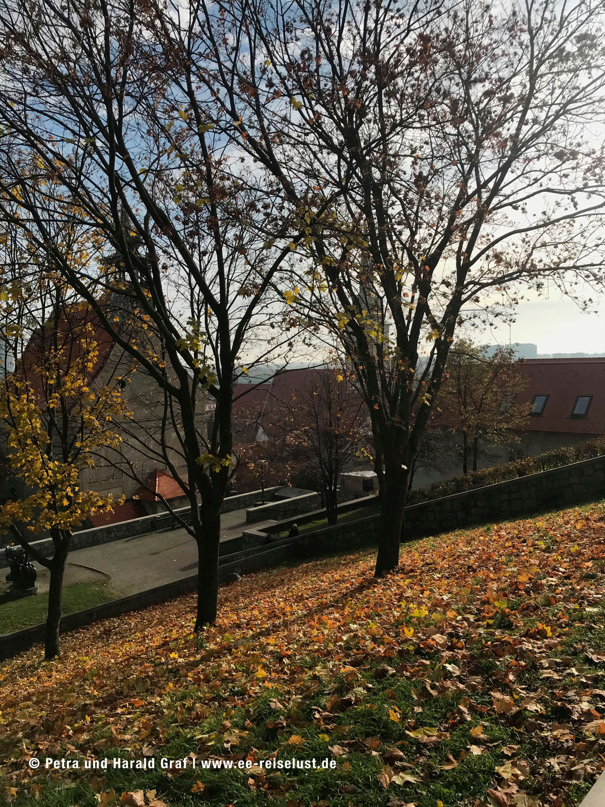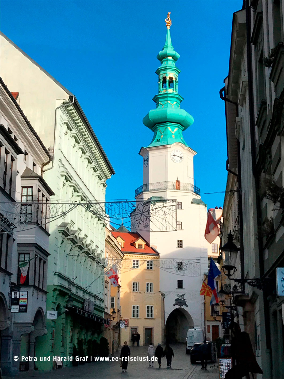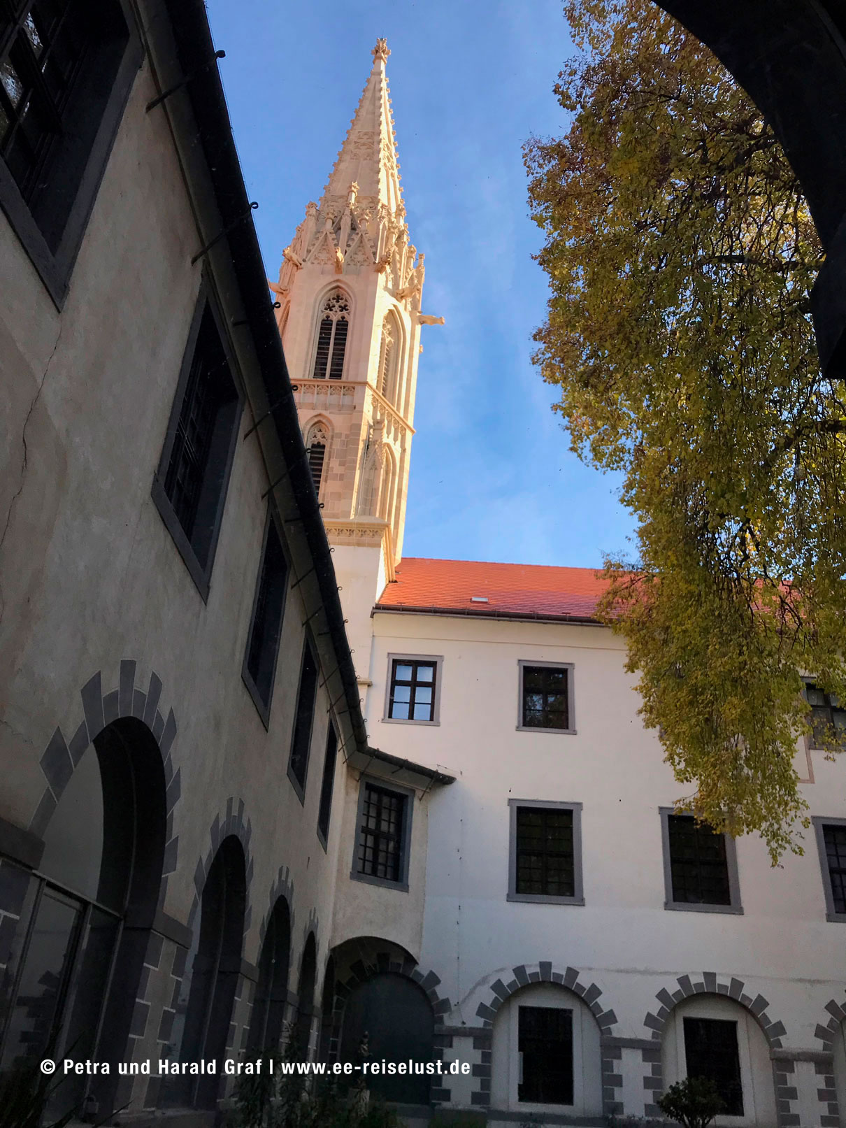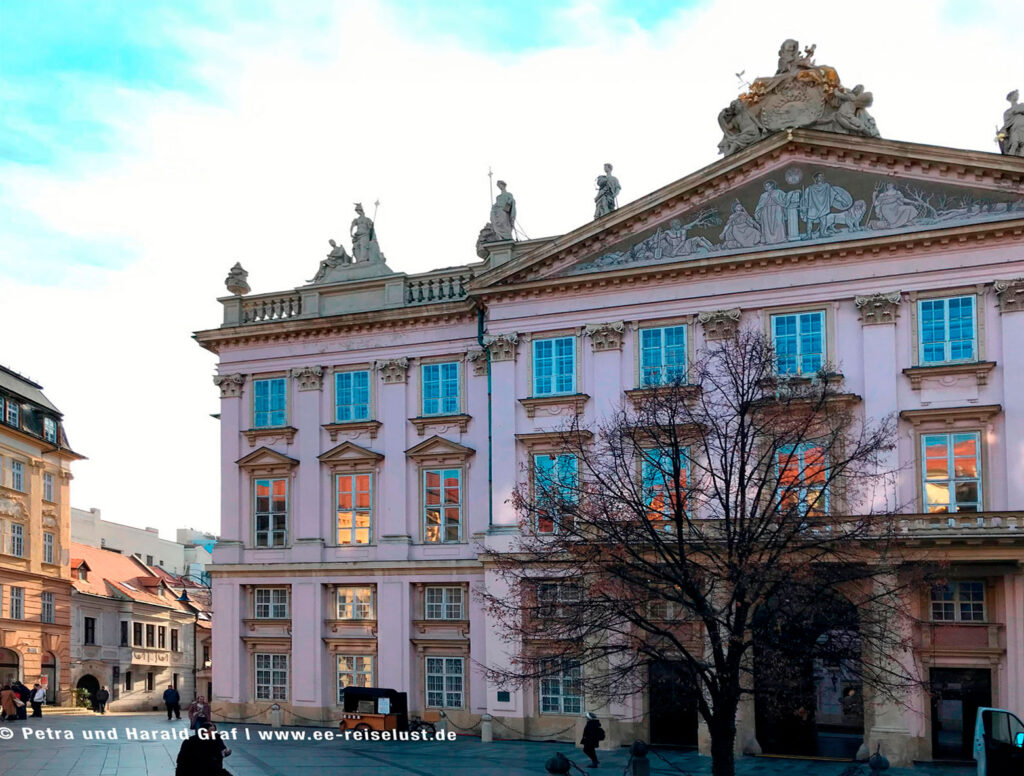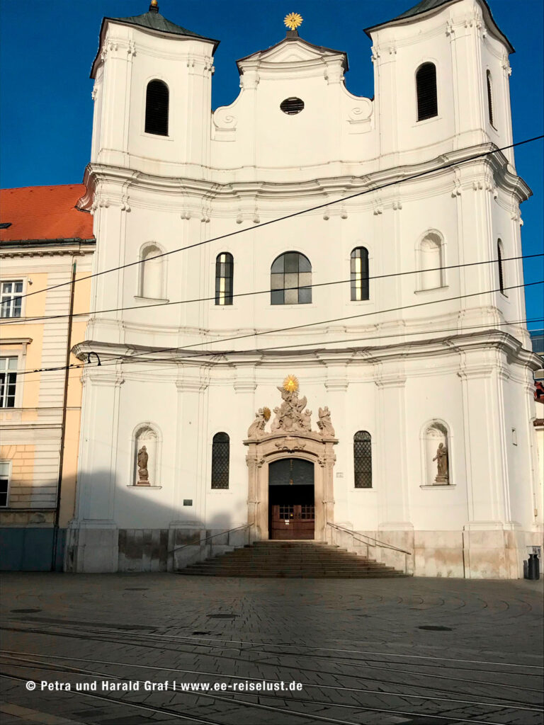 Nebenan befindet sich das Primatialpalais. In diesem klassizistische Palais, aus dem 18. Jahrhundert, wurde der Frieden von Preßburg nach der Drei Kaiser-Schlacht bei Austerlitz, geschlossen. Ein paar Meter entfernt findet man die Jesuiten-Kirche. Auf unserem Weg Richtung Burg durchquerten wir das Michaelertor. Dort bogen wir links ab und bergauf zur Pressburg. Unterwegs kamen wir an einer Kirche vorbei, die dem Aussehen nach eher in mediterrane Gegenden gepasst hätte.