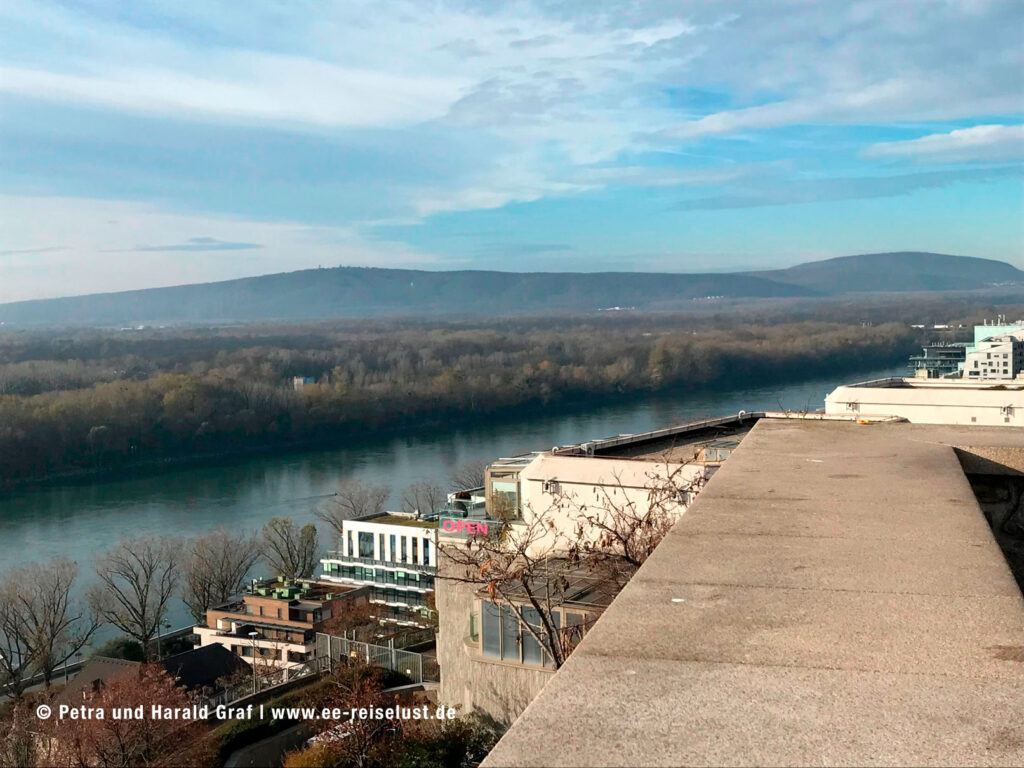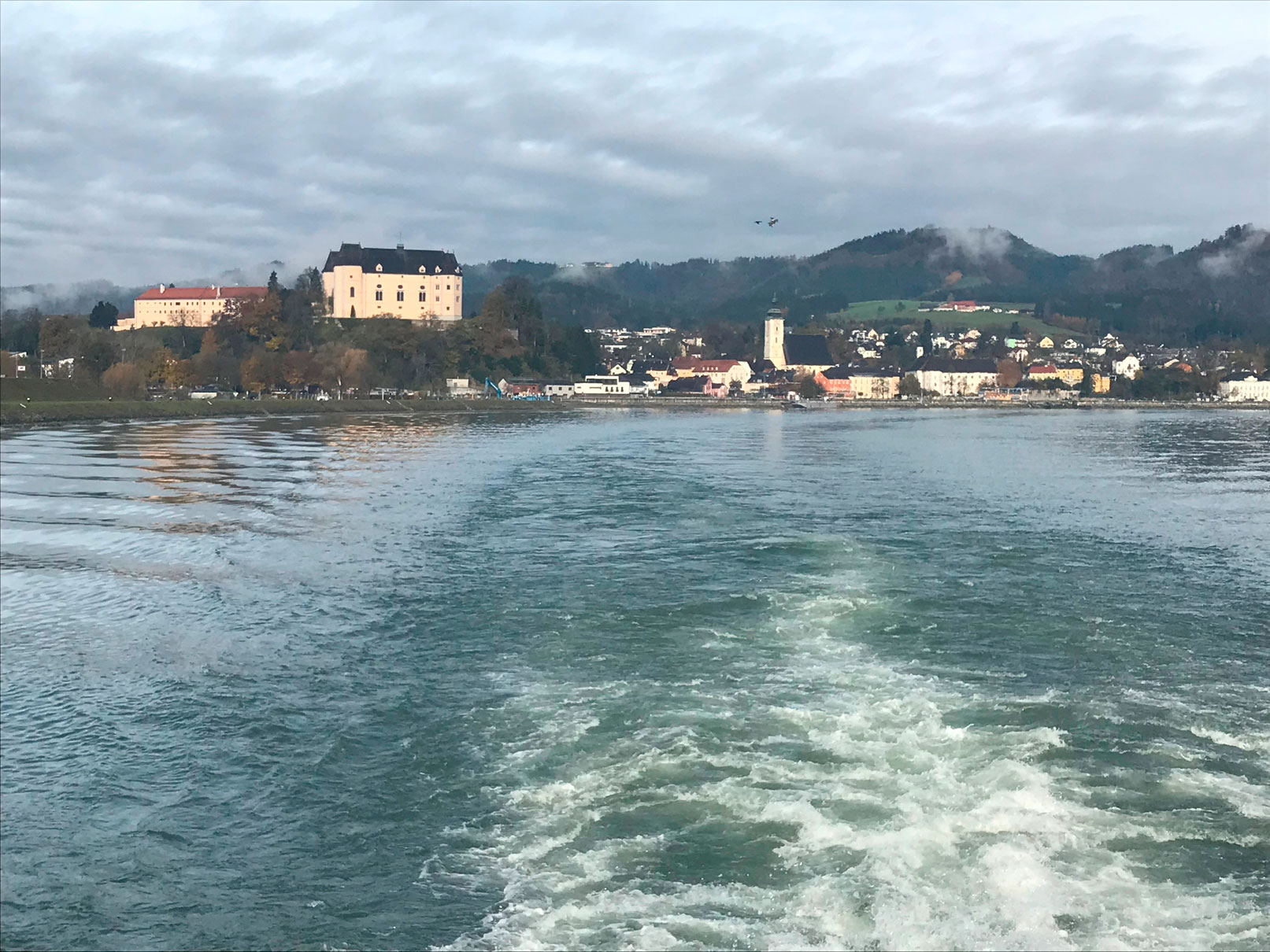Am nächsten Tag, nachdem wir die ganze Nacht durchgefahren sind (oder eher: gefahren wurden…), hieß es: geplante Anlegezeit in Linz 14.00 Uhr. Es war kalt, aber sonnig. So beschlossen wir, ein wenig die vorüberziehende Landschaft zu betrachten. Burgen, eine der Habsburger, Burgruinen und viel Natur.