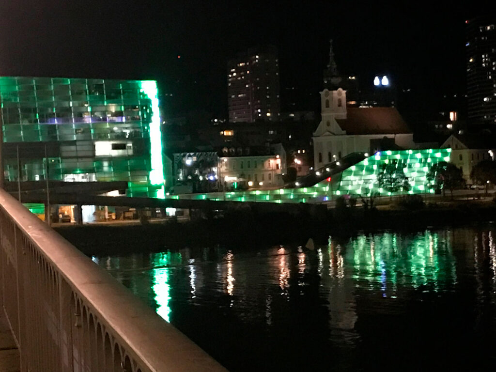 Also kauften wir 2 Scheine. Und wider Erwarten machte es sogar Spaß. Leider hatten wir kein Glück. Immer fehlte eine Zahl. Mittlerweile war es nach 17.00 Uhr und draußen schon dunkel, als die freudige Stimme des Kapitäns erscholl. „Wir nähern uns Linz. Anlegezeit 18.00 Uhr.“ Na super, was soll man um 18.00 Uhr noch groß machen. Aber einen kleinen Spaziergang wollten wir dann doch machen. Wir legten bei der Nibelungenbrücke an.