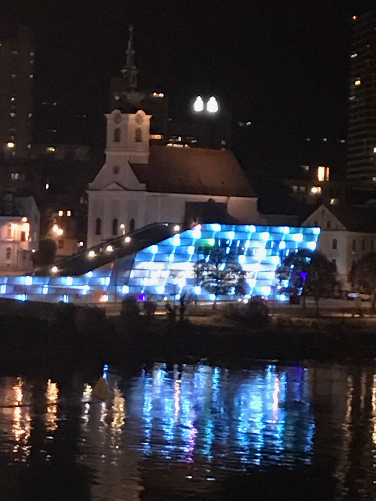 Wirklich beeindruckend. Endlich fanden wir eine Bäckerei, bei der wir Linzer Augen und Neukirchner Krapferl kauften. Sahen echt lecker aus. Man muss doch etwas aus dem Urlaub mit nach Hause bringen. Mittlerweile war es empfindlich kalt geworden, sodass wir auf schnellstem Weg zu unserem mollig warmen Schiff zurückkehrten. Vor dem Schiff angekommen, machten wir noch Fotos vom Ars Electronica Center (gilt als Zentrum der UNESCO City of Media Arts), das sich auf der anderen Seite der Donau befand.